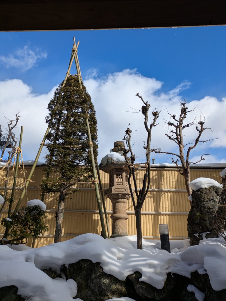 雲が多めの空模様ですが時々日差しがあります。 気温は当館玄関先の気温計で0℃まで上がってきました。夜から今朝にかけては−5℃でした。 貸切風呂・湯畑源泉熱の湯です。 雪が残っていますので雪見風呂をお楽しめいただけます。 雲が多めですが青空も広がっています。 今朝の様子です。 今朝も青空が広がっていました。 湯畑の湯けむりがも…