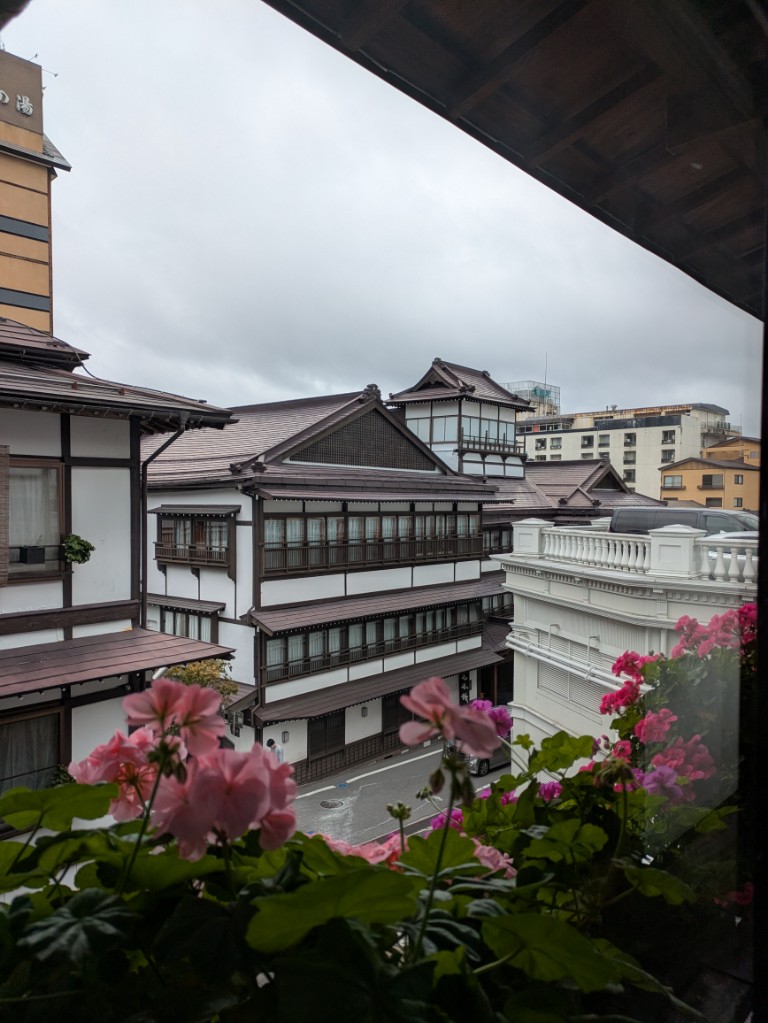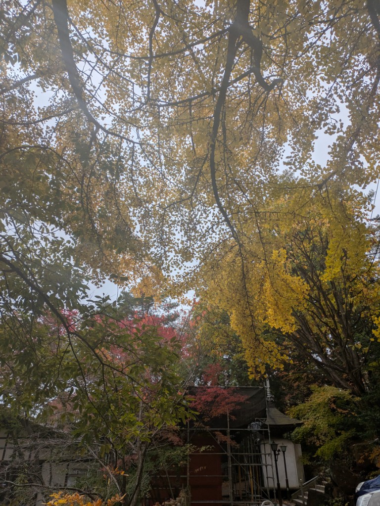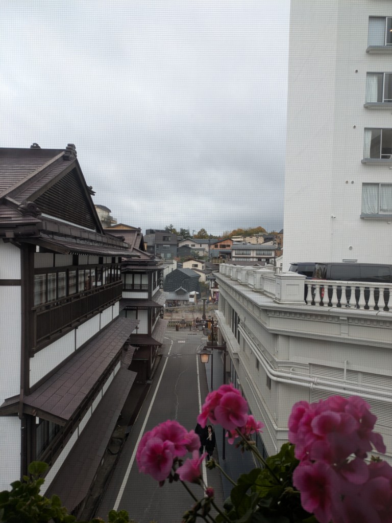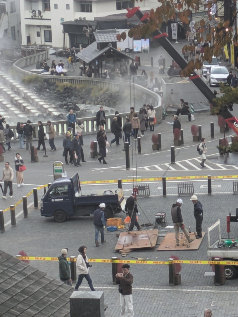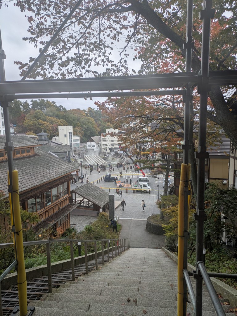 役場会計課や旅館組合に行きながら光泉寺山門から湯畑を見たら湯畑ツリーの準備をしていました。