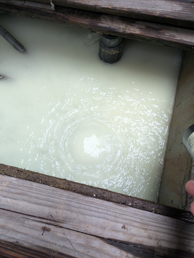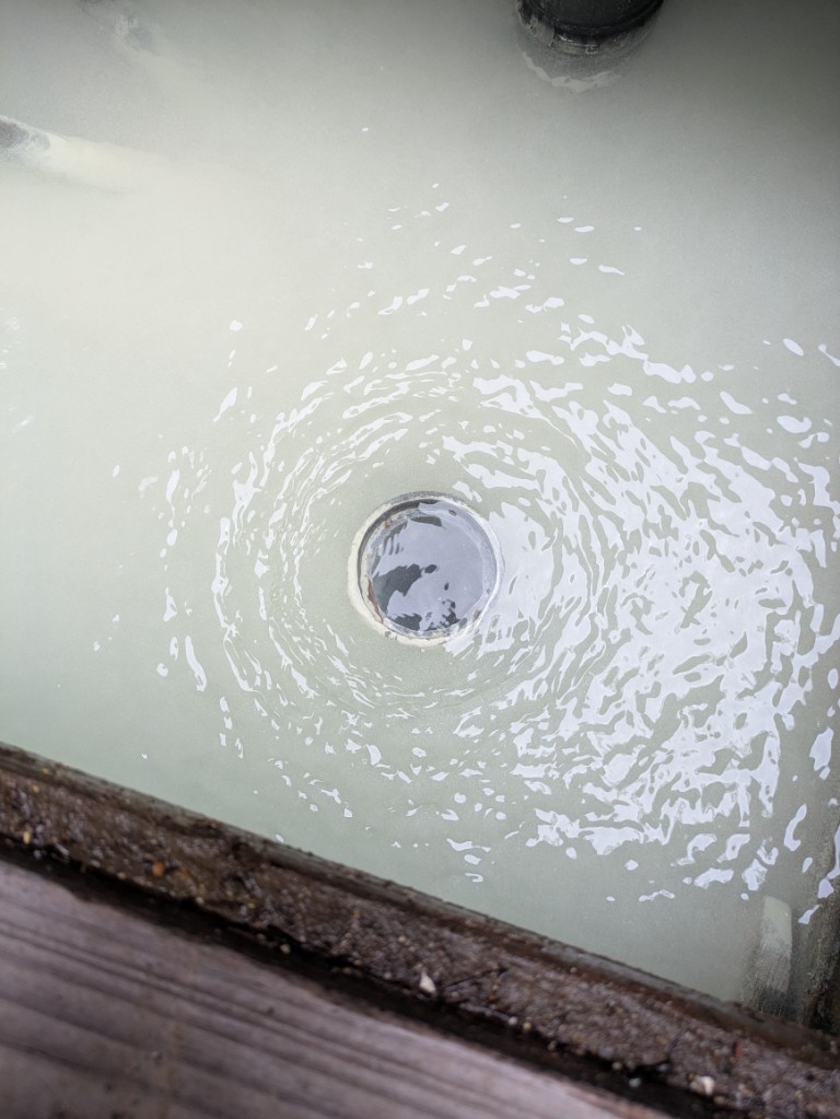 勢い良く湯花の塊や濁ったお湯が流れてきます。