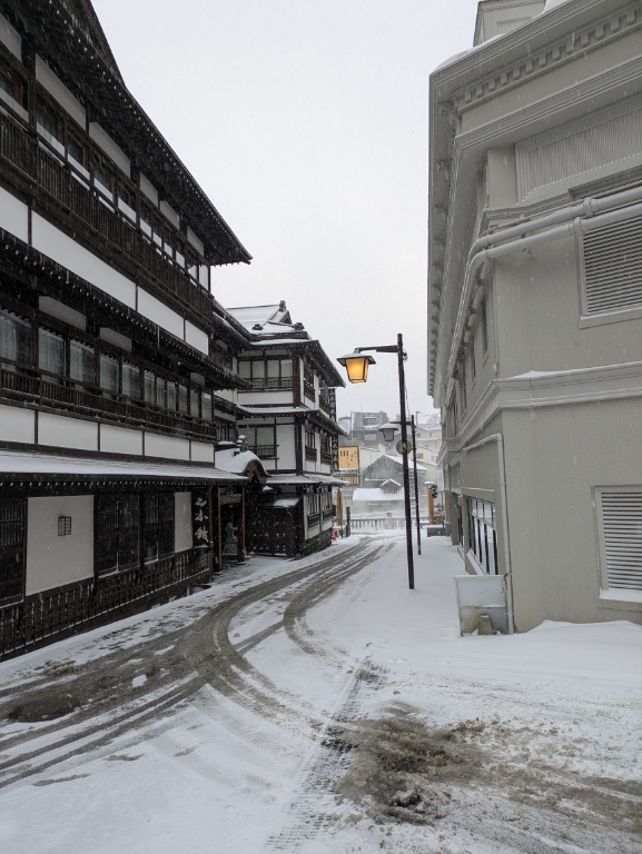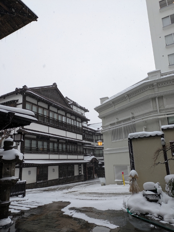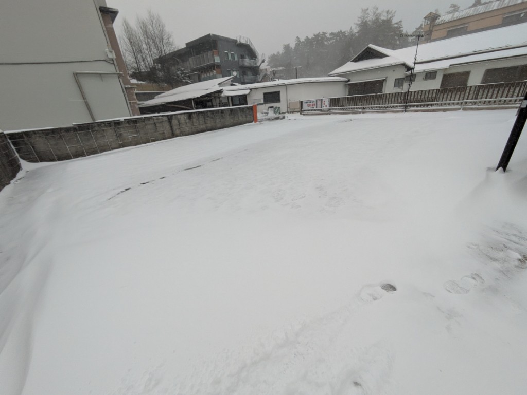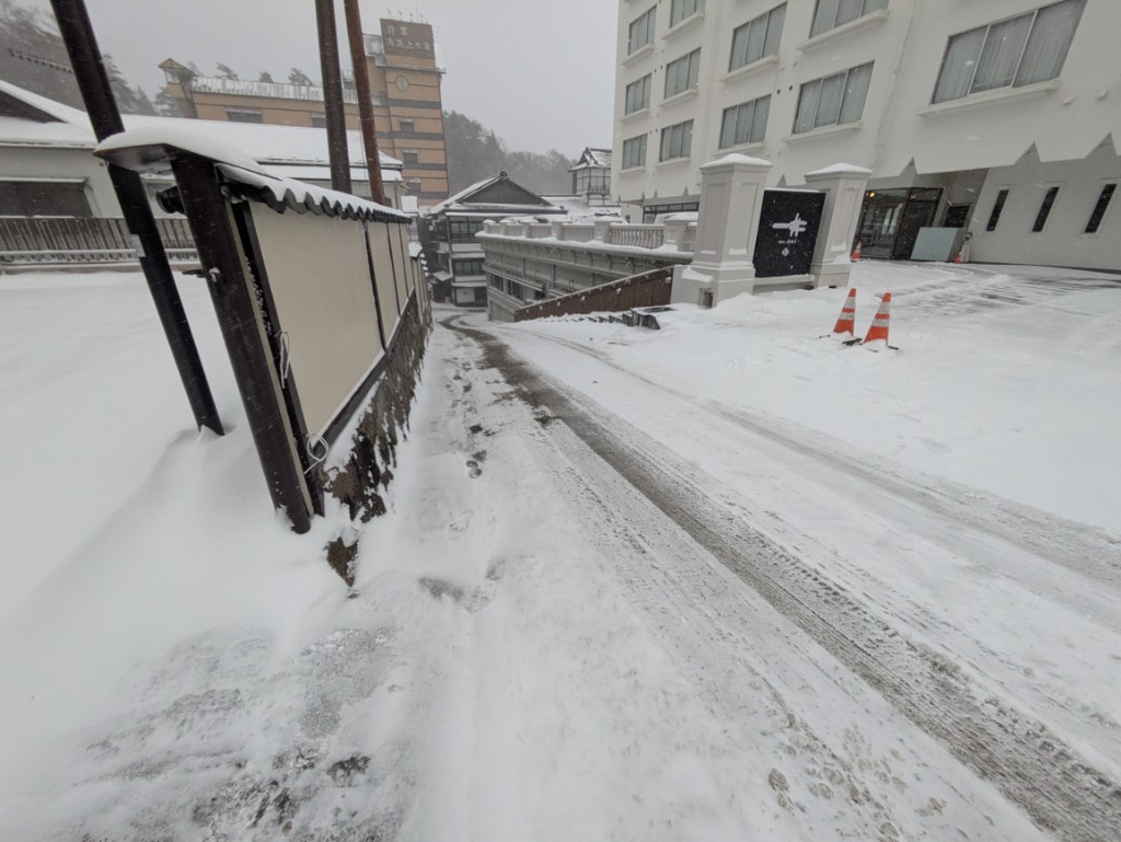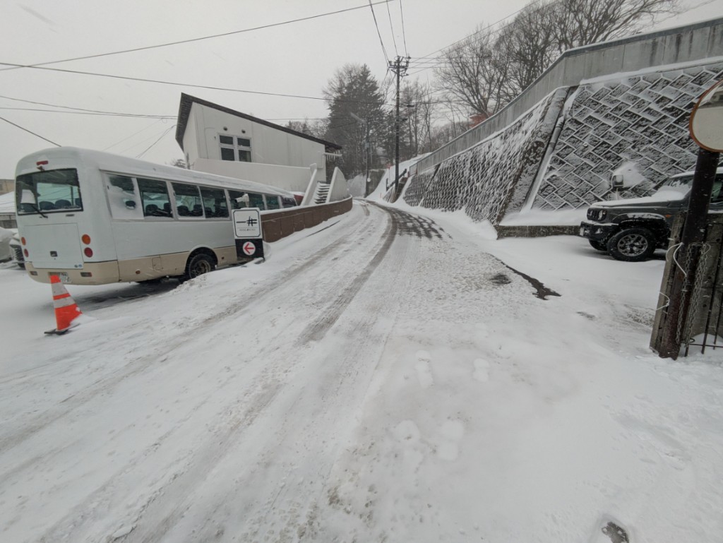 気温が低いので融雪道路や当館駐車場も雪で真っ白でした。