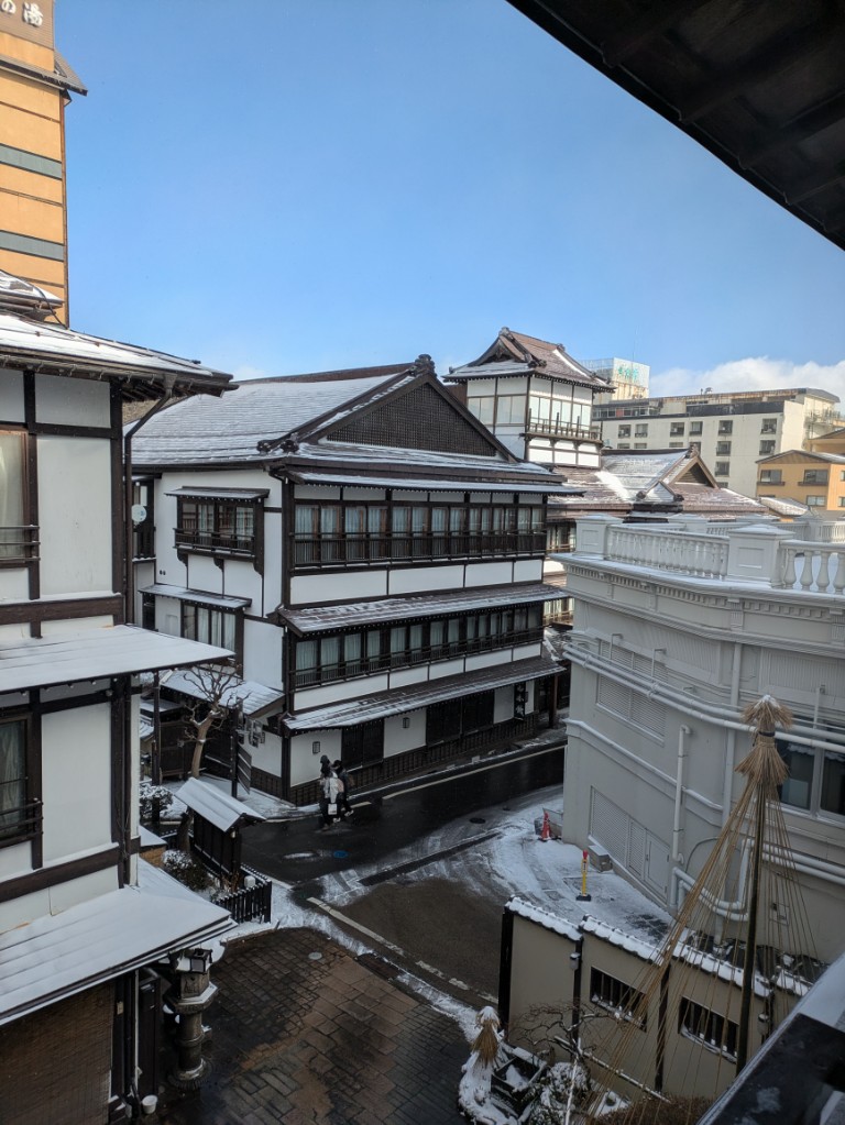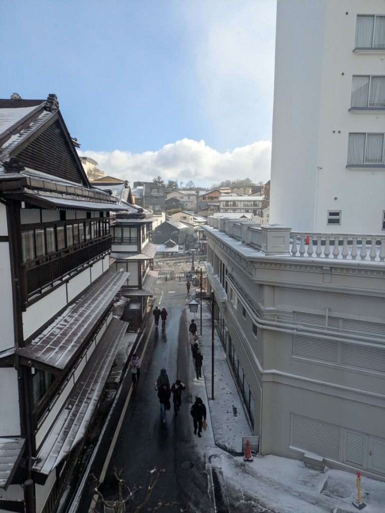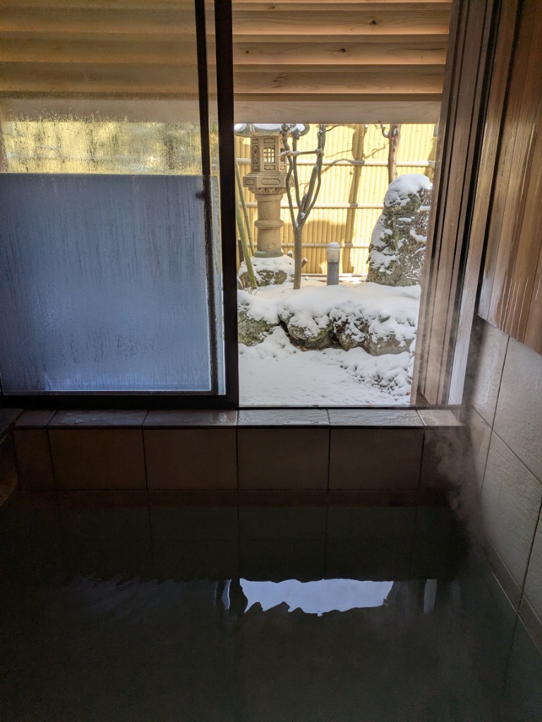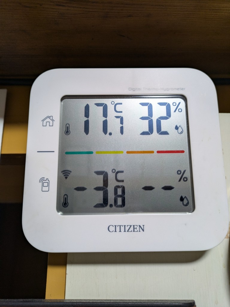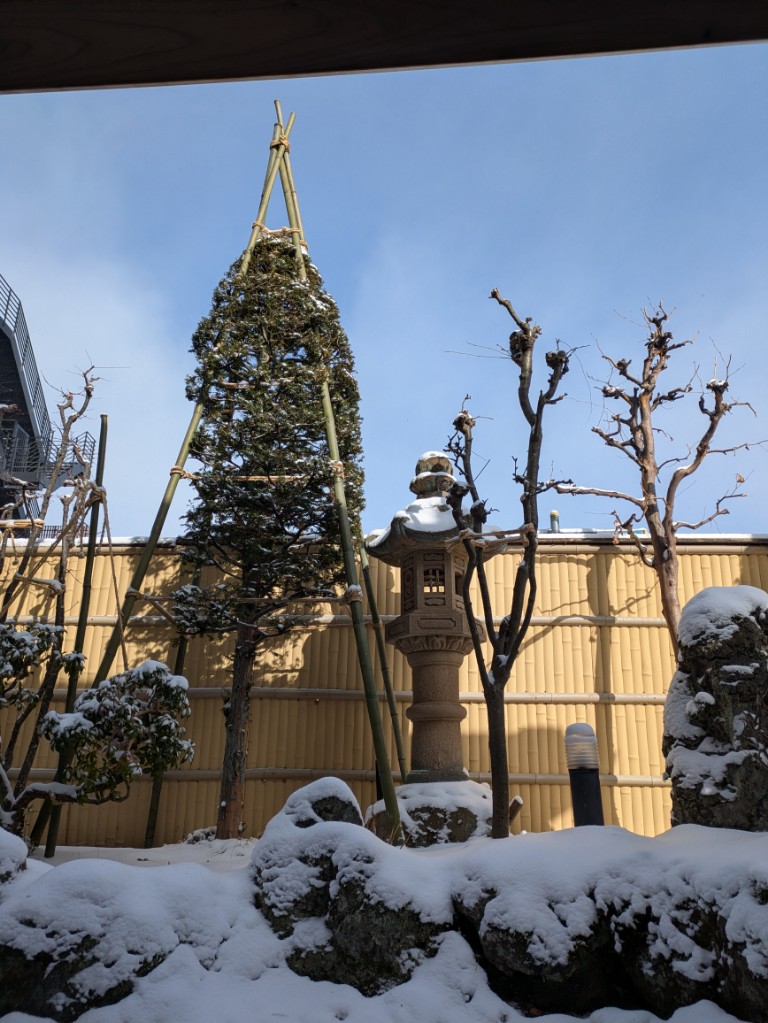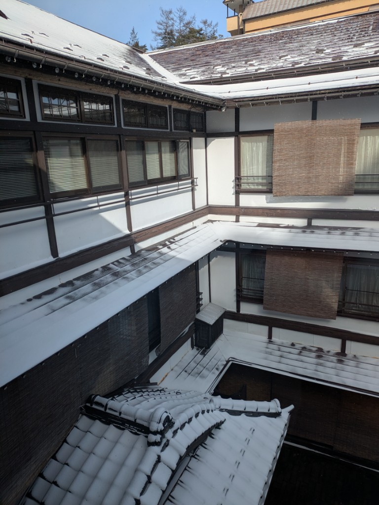 気温は当館玄関先の気温計で−3℃ととても冷え込んで寒くなっています。北風が強く吹いていますので体感温度は更に下がります。