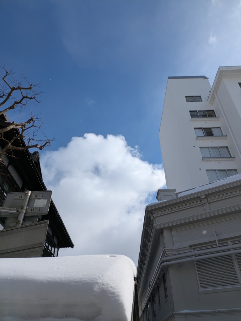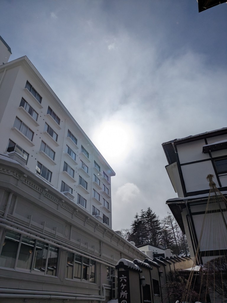 気温は当館玄関先の気温計で−2℃まで上がってきました。昨夜の−10℃に比べるとだいぶましです。
