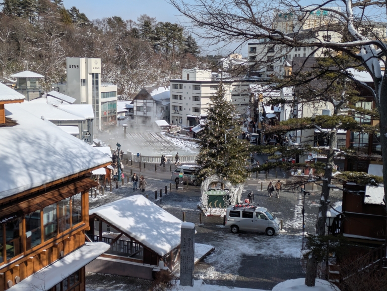 気温は当館玄関先の気温計で−4℃と氷点下のままですが雪も止んで青空が広がっていますのでそれ程気にはなりません。