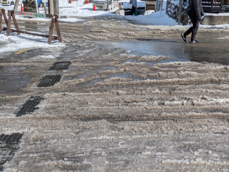 陽当たりの良い場所は雪が溶けてびしゃびしゃになっています。