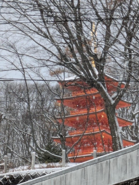当館前の坂道から見た光泉寺の五重の塔が雪景色で綺麗でした。