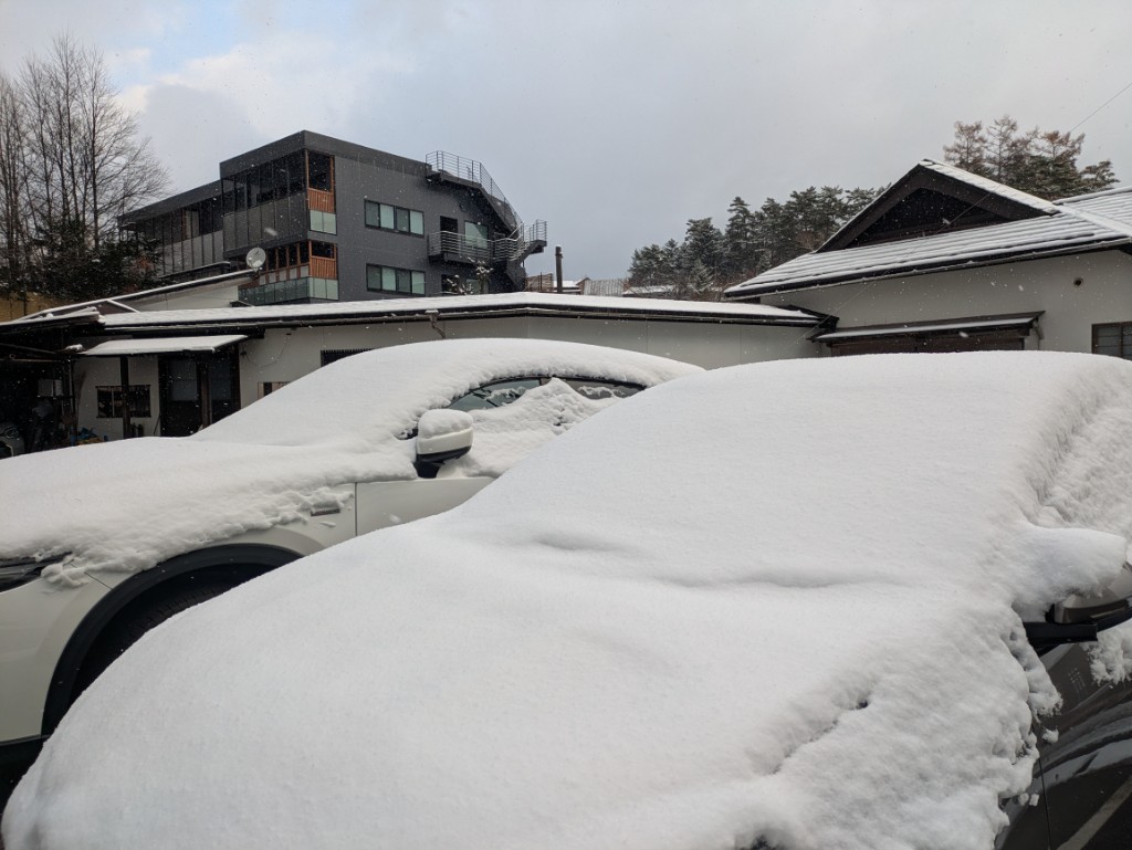 駐車場のお客様の車の雪下ろしを今シーズン初めて行いました。サラサラの粉雪が5cm位積もっていました。