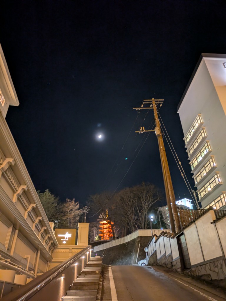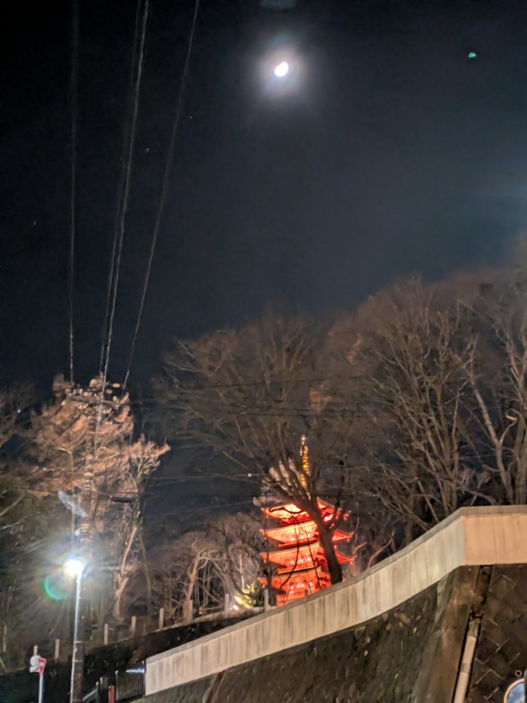 今夜のお月様と光泉寺五重の塔 2025 11/28 益成屋ブログ 2025年11月28日 気温は当館玄関先の気温計で3℃台ですが冷たい北風が強く吹いていますので余計寒く感じます。 当館前の坂道から見えた今夜のお月様と光泉寺五重の塔です。 益成屋ブログ シェアお願い致します♪ URLをコピーしました! URLをコピーしました! 晴れて良いお天気です 晴れて良いお天気です 関連記事 少し気温が上がっています 2025年11月30日 晴れて良いお天気です 2025年11月29日 晴れて良いお天気です 2025年11月28日 曇天です 2025年11月27日 晴れて日差しがあります 2025年11月26日 久しぶりの曇り空です 2025年11月25日 薄い雲が広がっています 2025年11月24日 薄い雲が広がっています 2025年11月23日