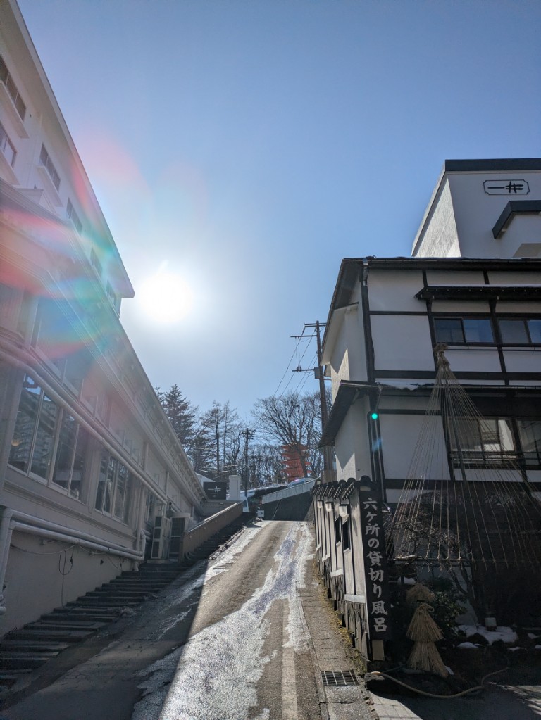 気温は当館玄関先の気温計で7℃近くまで上がっていますが冷たい北風が吹くと寒く感じます。
