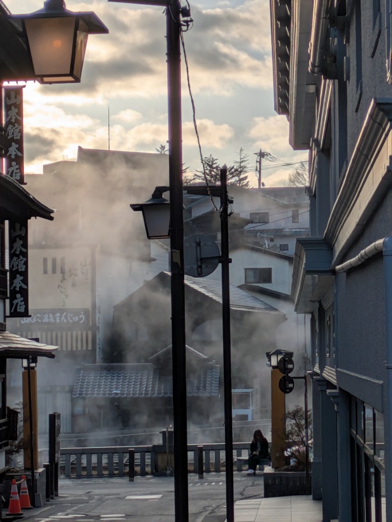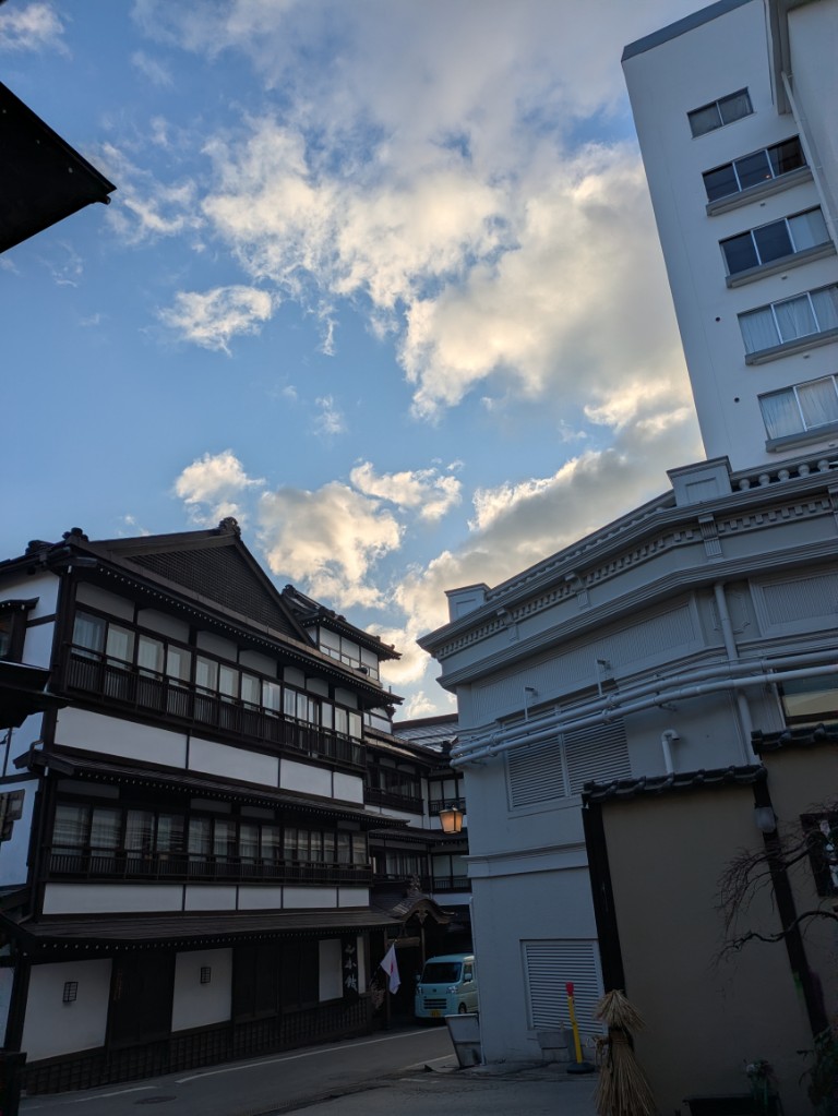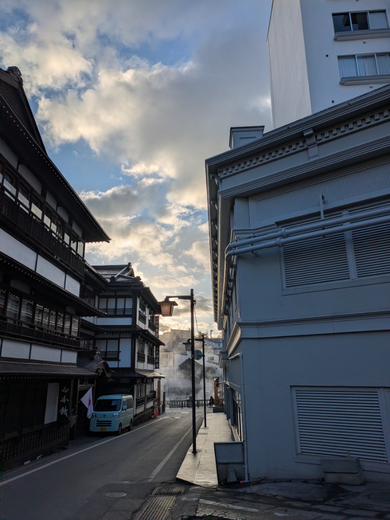 朝方は湯畑方面は雲が多めでした。