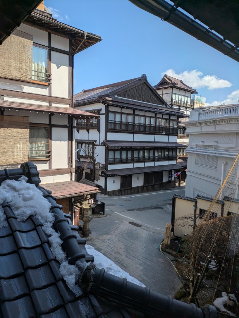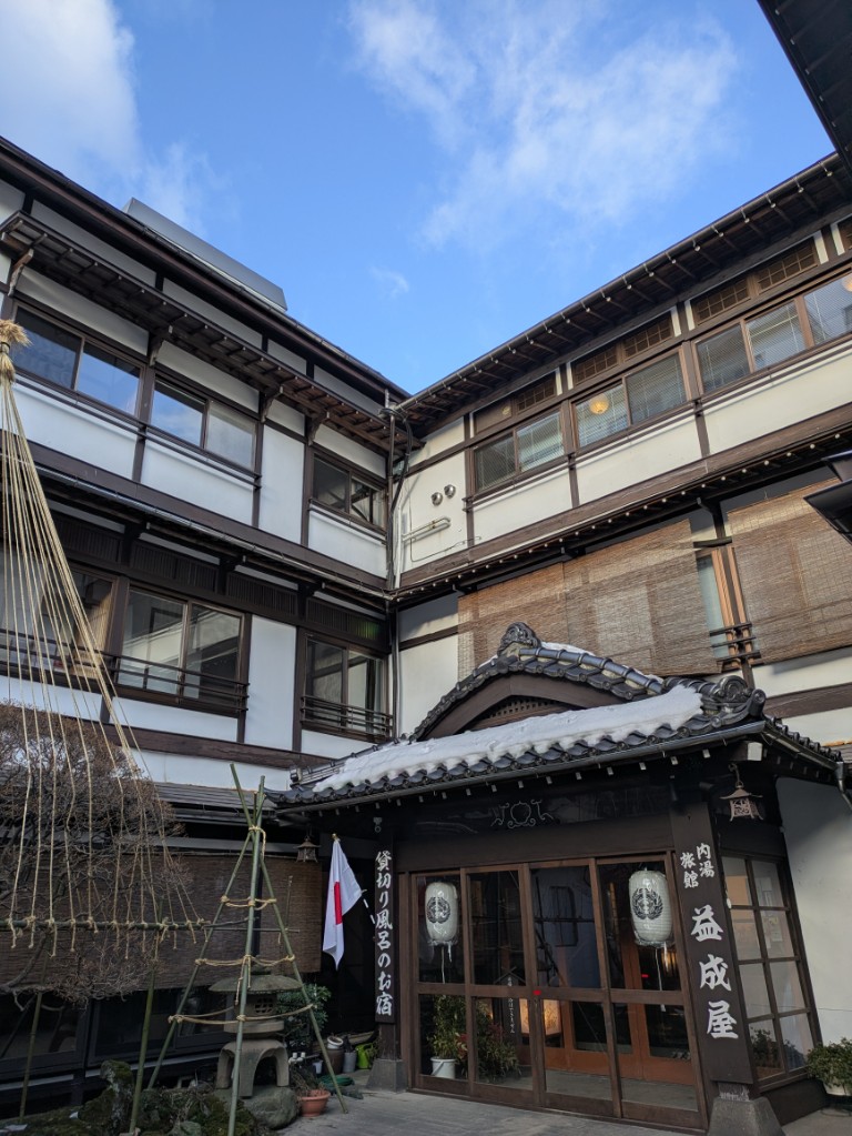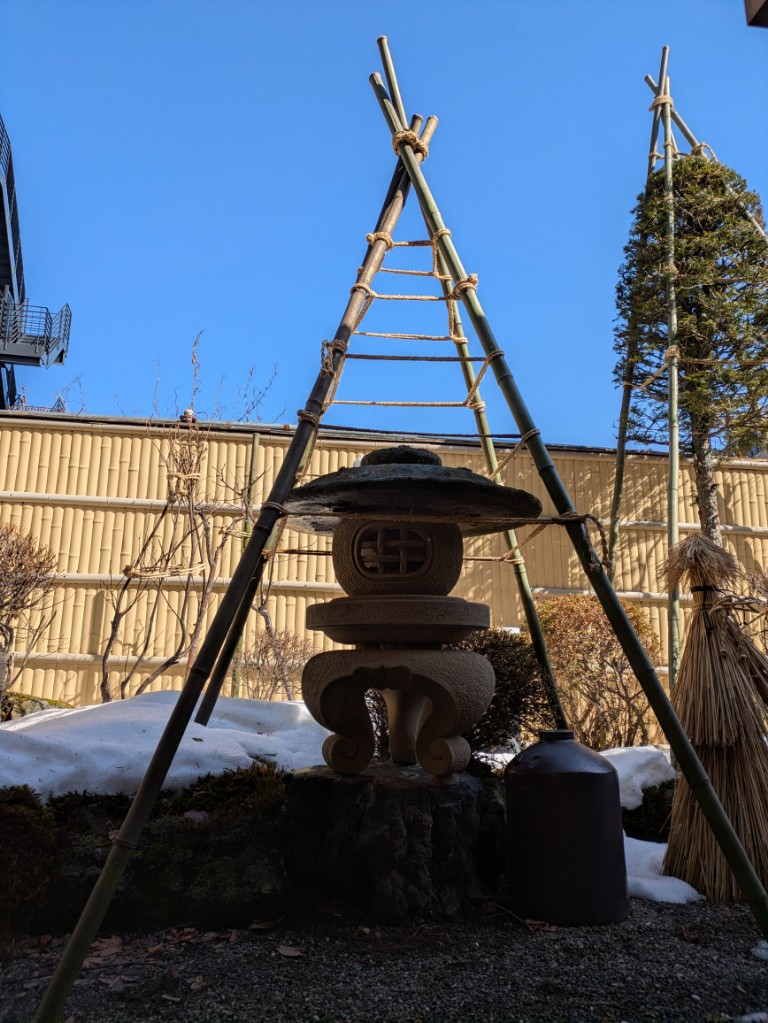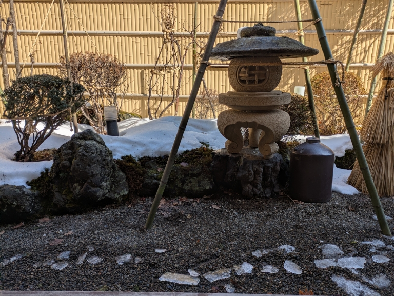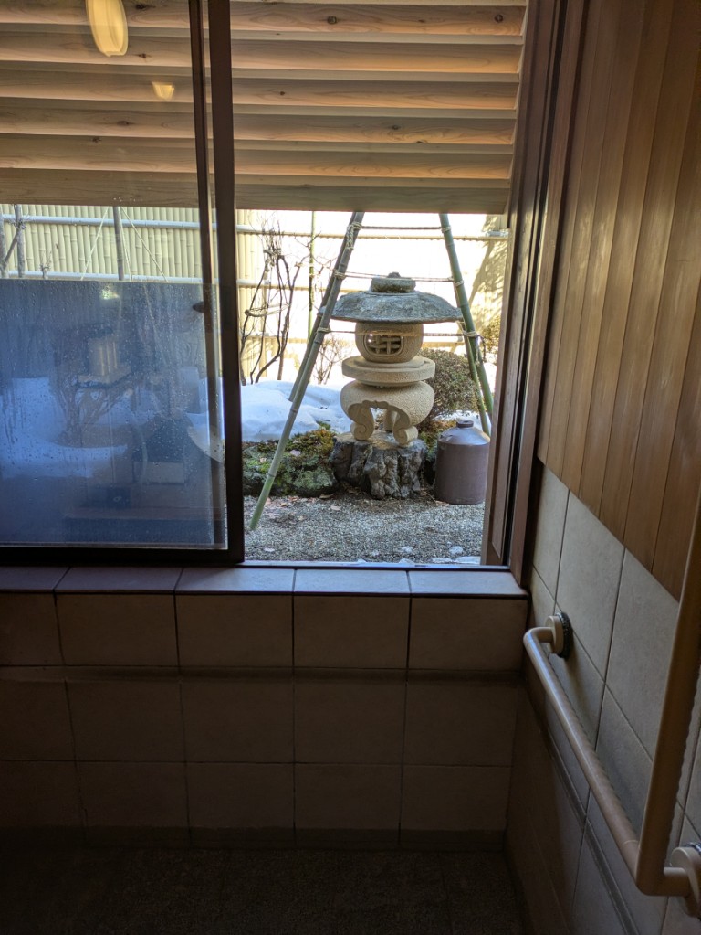 ここ数日は気温が上がって貸切風呂庭の奥の土も見え始めてきました。