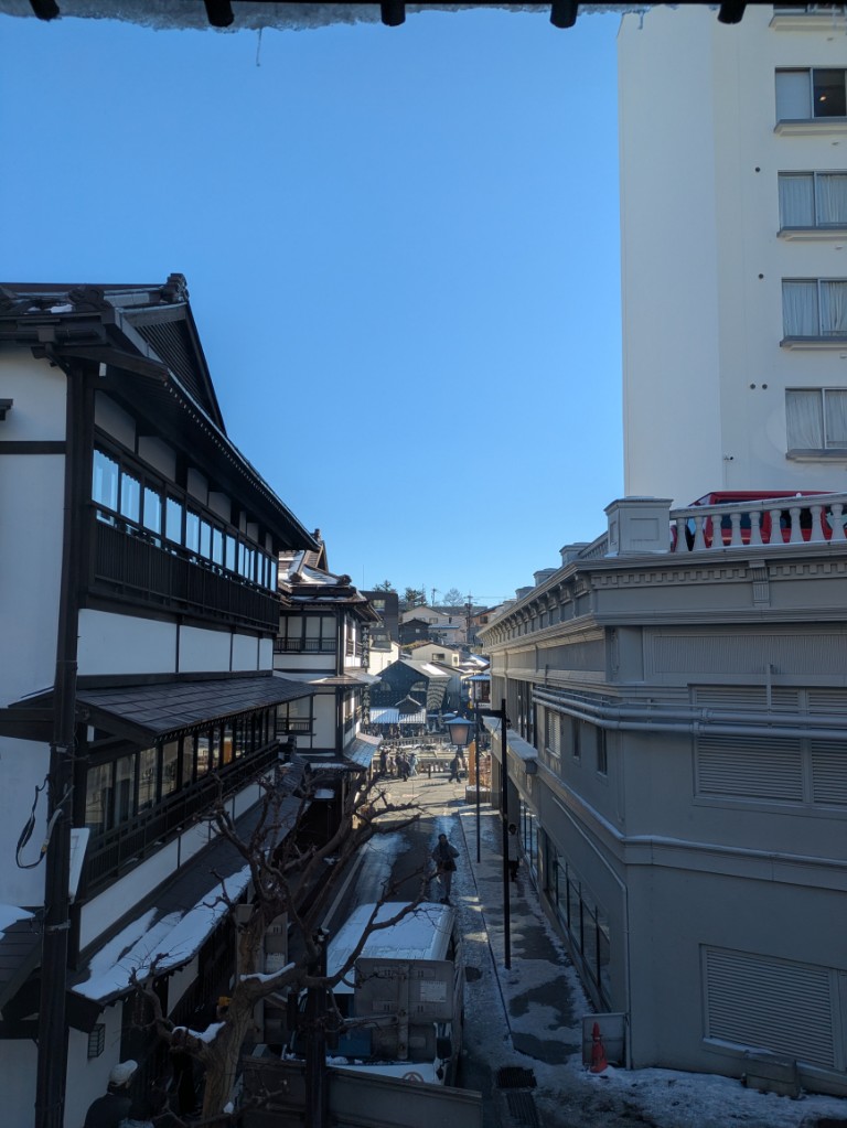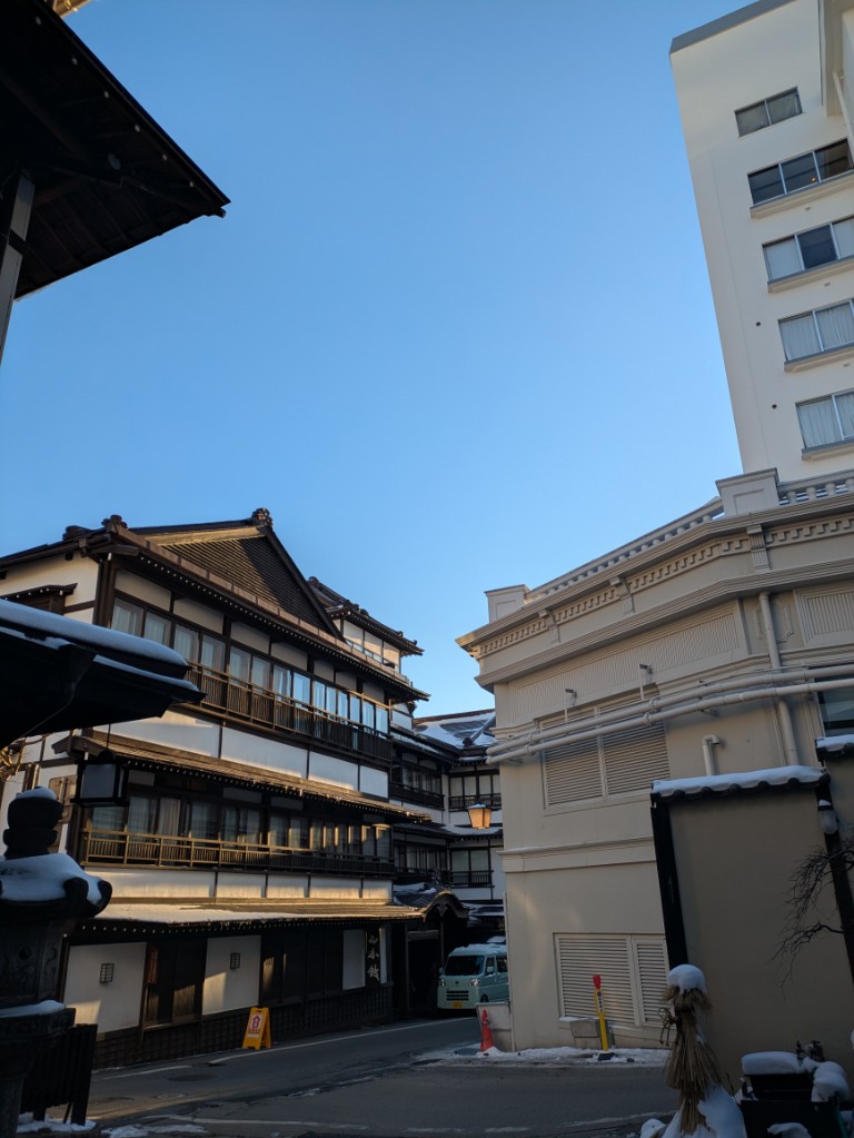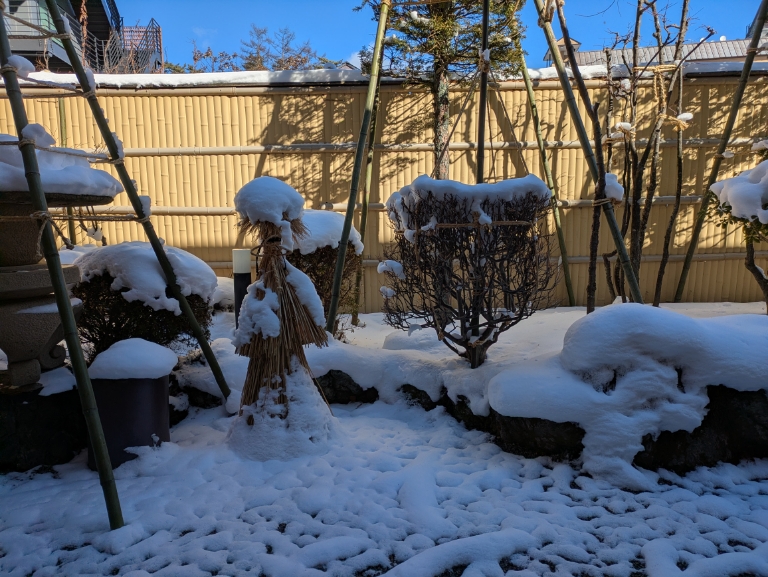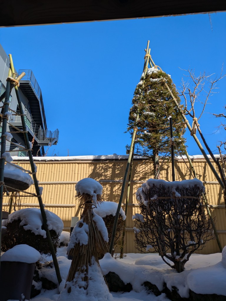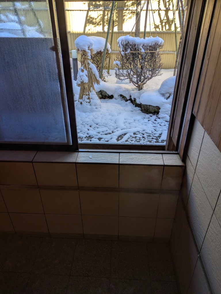 青空が広がって日差しもありますが気温が低いので貸切風呂庭の雪も溶けずに残っています。