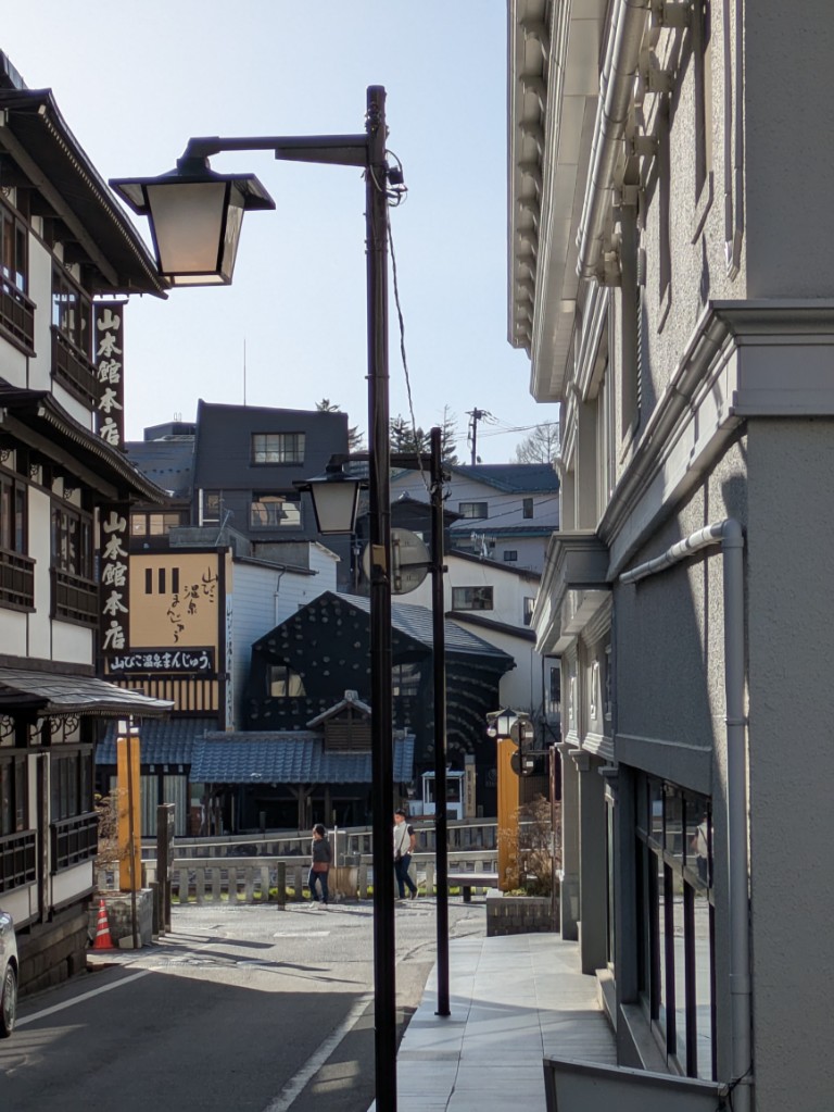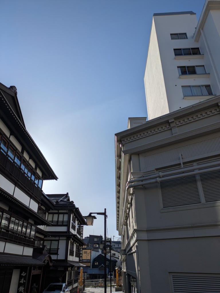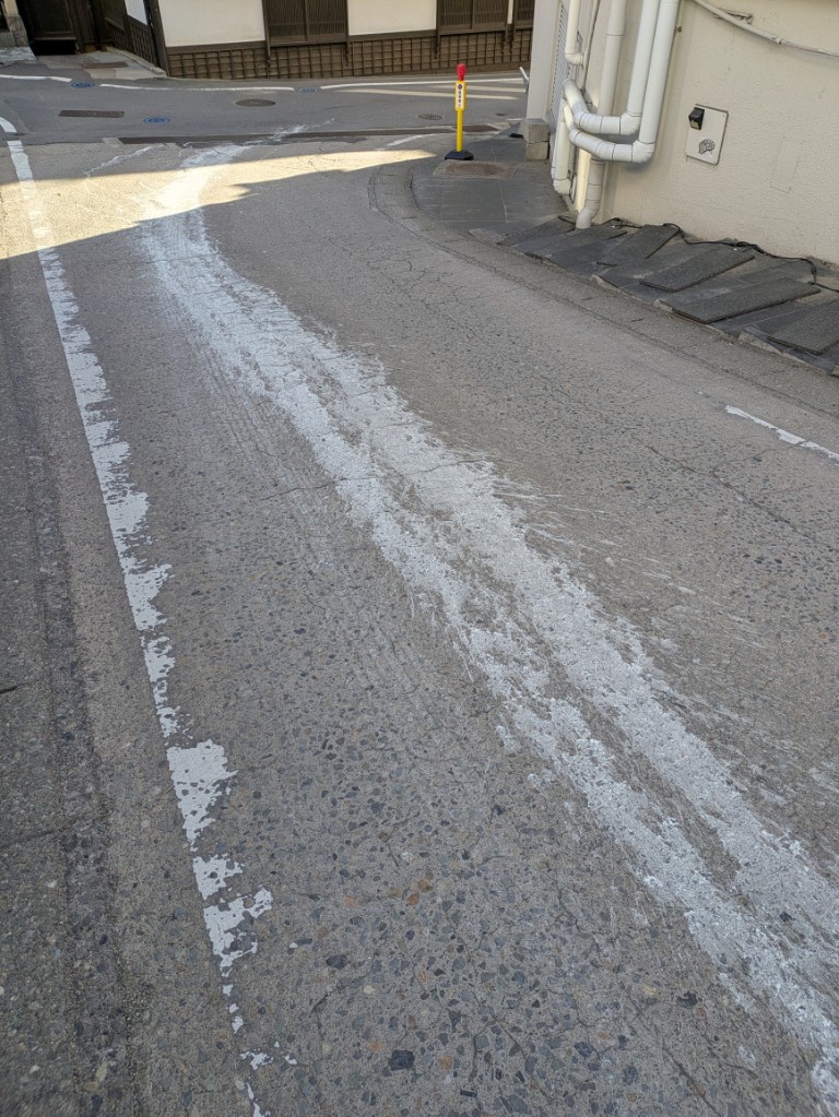 湯畑源泉のお風呂が濁っていました。湯畑で湯花採取をしているようで道路には湯花を運搬した車から流れた温泉が白く残っていました。