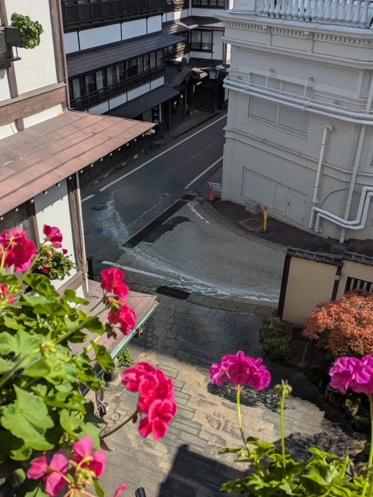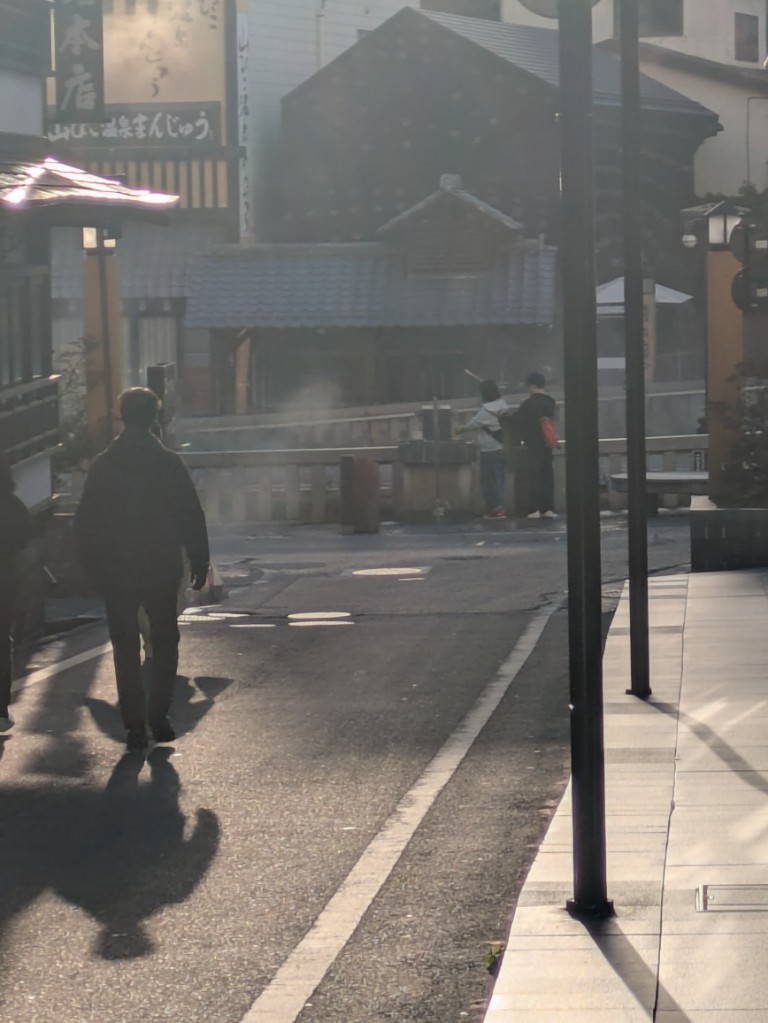 やはり湯畑で湯の花採取をしているようで湯の花を積んだ軽トラックが通った後が白くなっていました。