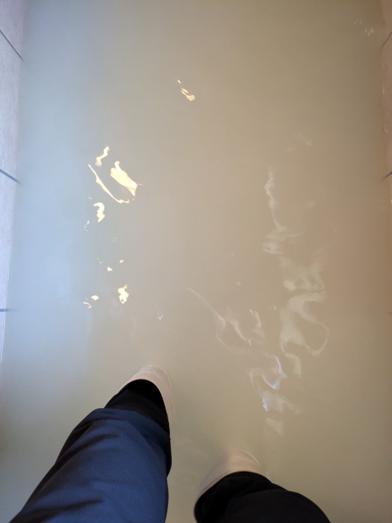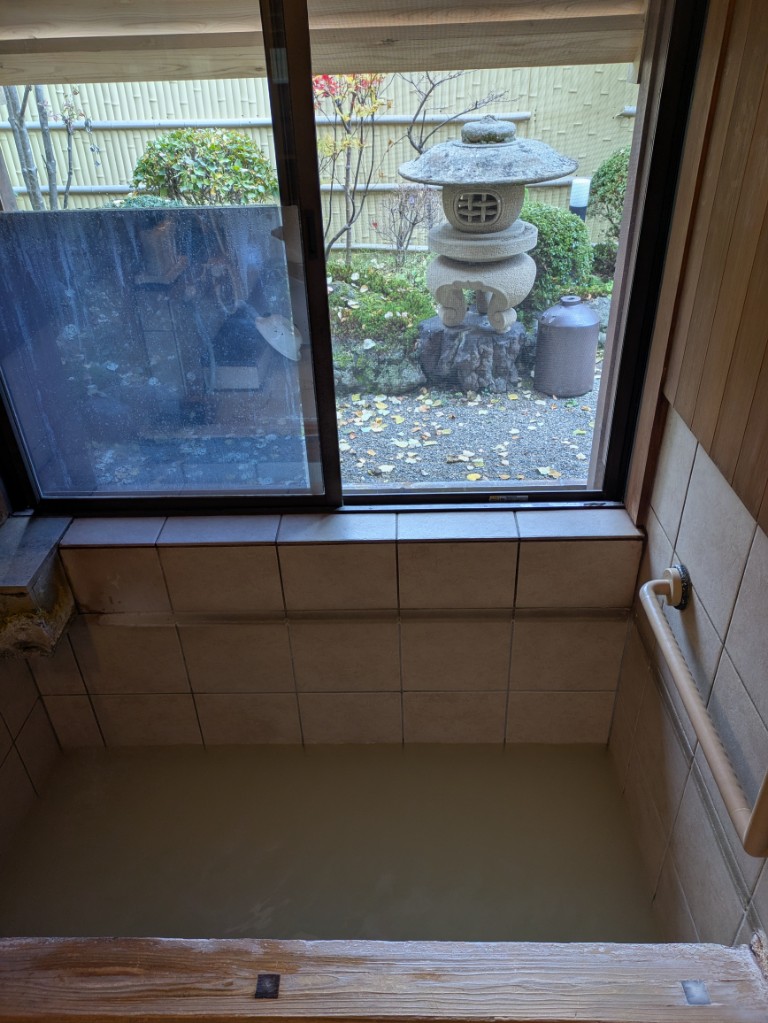 湯畑の湯樋で湯の花採取をしているようで湯畑源泉のお風呂が濁っていました。