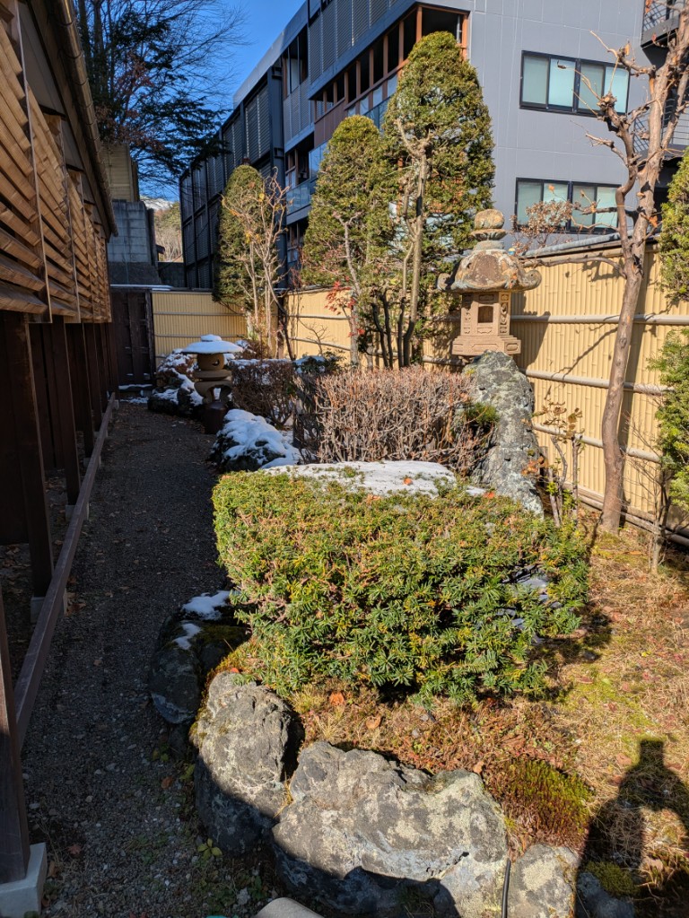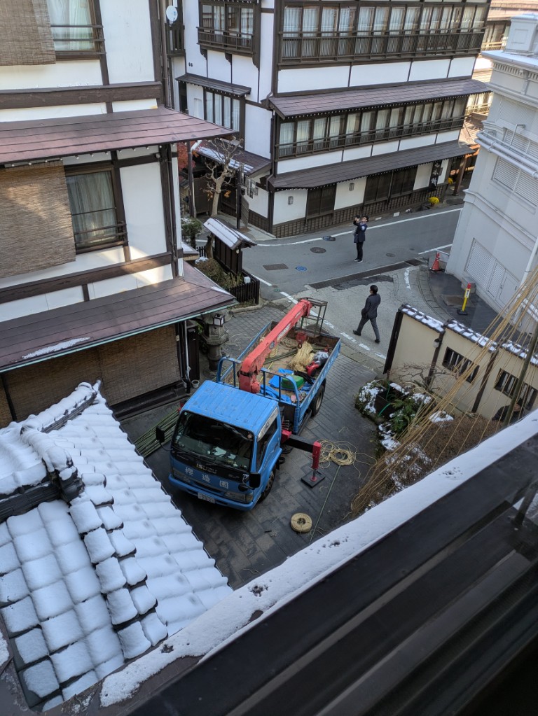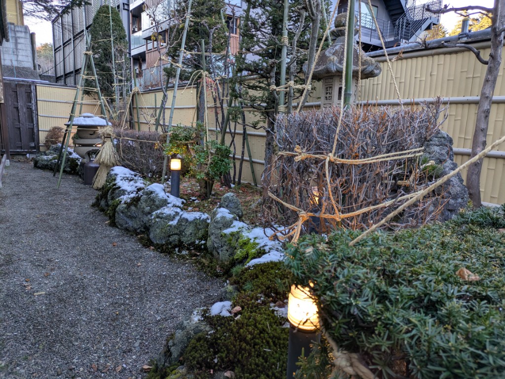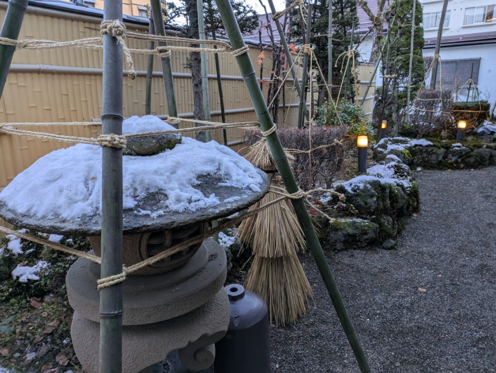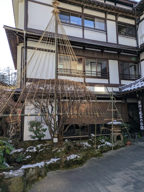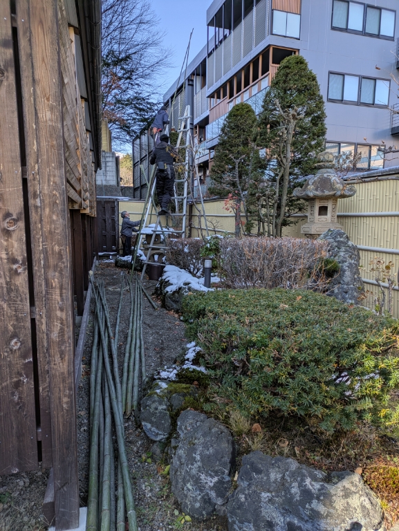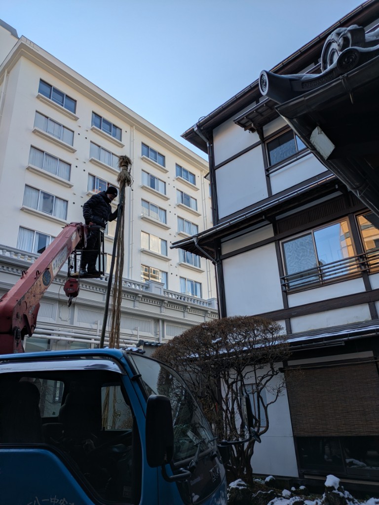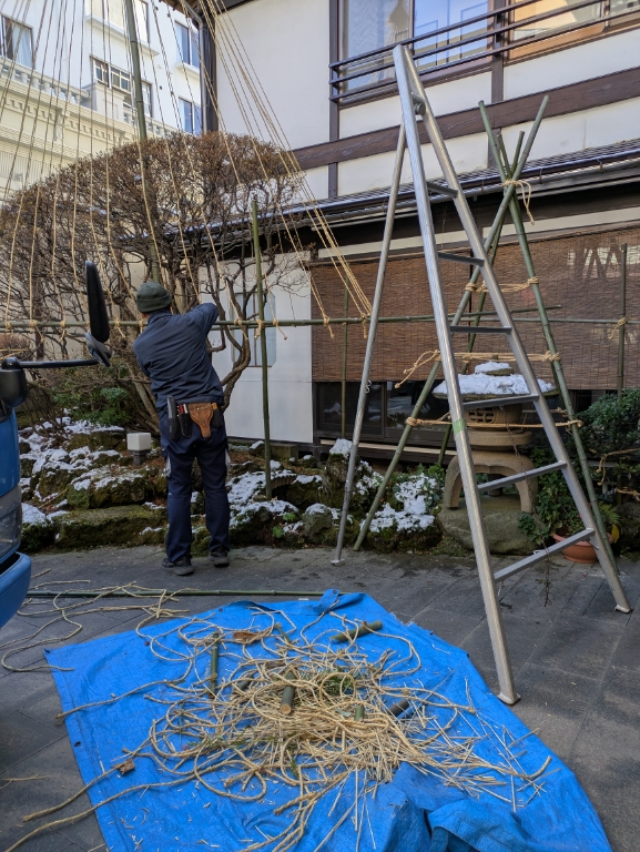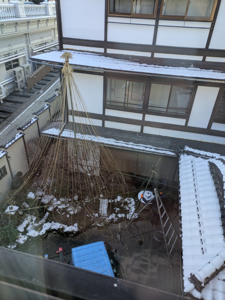 本日も休館ですので午前中から職人さんに来ていただき玄関先と貸切風呂庭の植木の雪吊りをしていただきました。