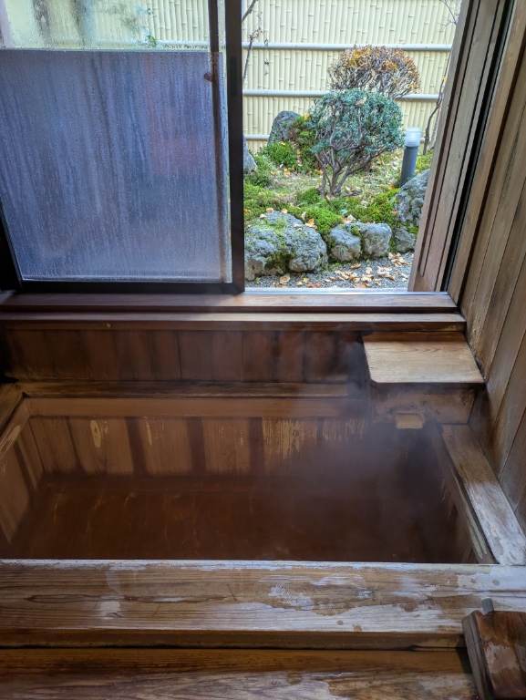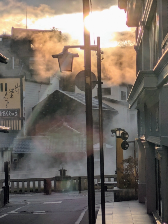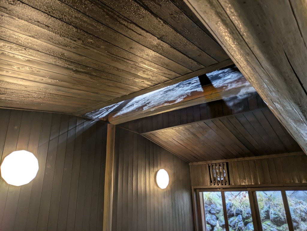 1階男性用大風呂の空気抜きから日差しが差し込み湯気が面白いです。