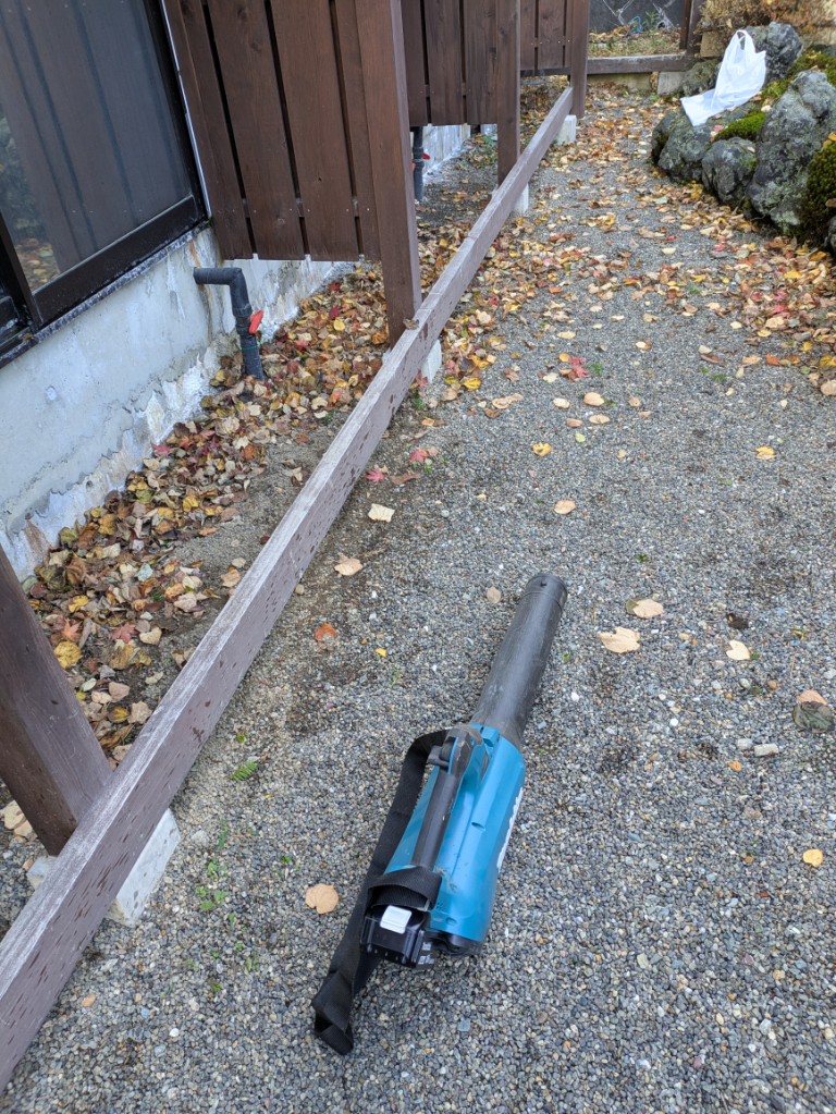 落ち葉は意外と乾いていましたのでブロワーを使ってまとめてからブロワー集じん機で吸い込みました。