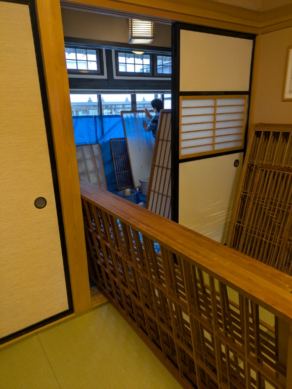 白旗源泉のメンテナンスを終えたら次は館内の障子紙の貼替えをしました。