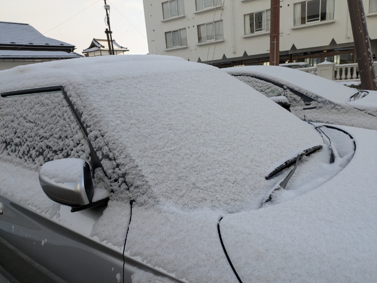 駐車場のお客様の車に雪が積もりましたので雪下ろしをしました。サラサラの粉雪が3cm位積もっていました。