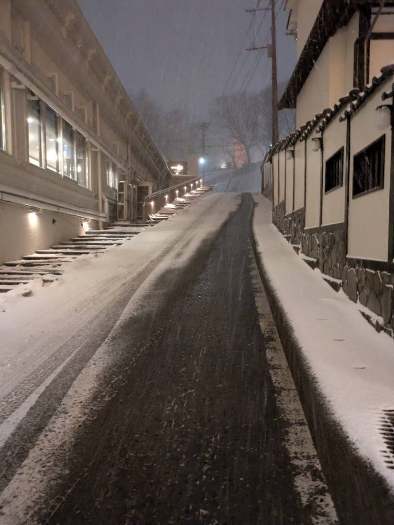 当館前の融雪道路や玄関先も厳しい冷え込みと雪の量で融雪が間に合わず積もりだしました。