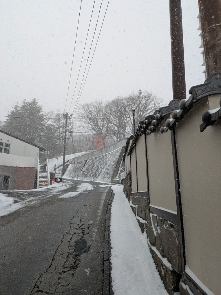 当館前の坂から見える雪景色の光泉寺五重の塔です。