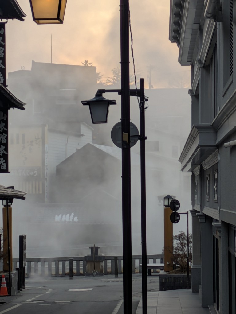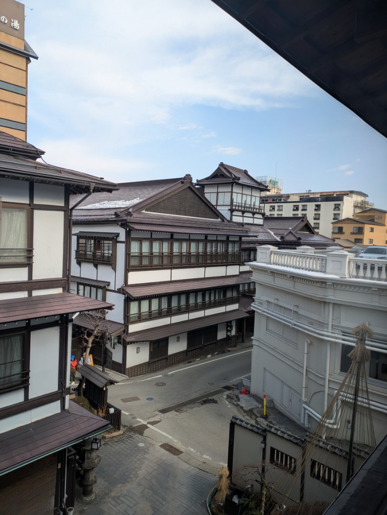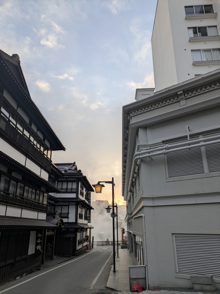 時々日差しがありますが本日は雲が多めの空模様です。温泉街は静かです。