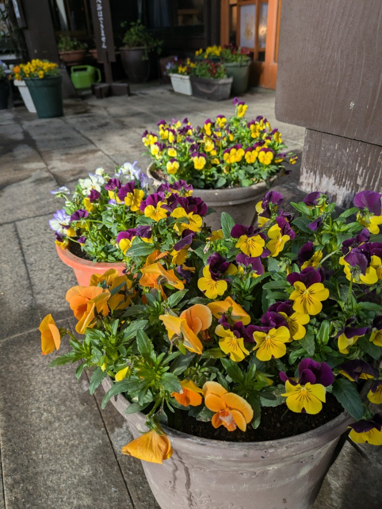 玄関先のパンジーが綺麗に咲いています。