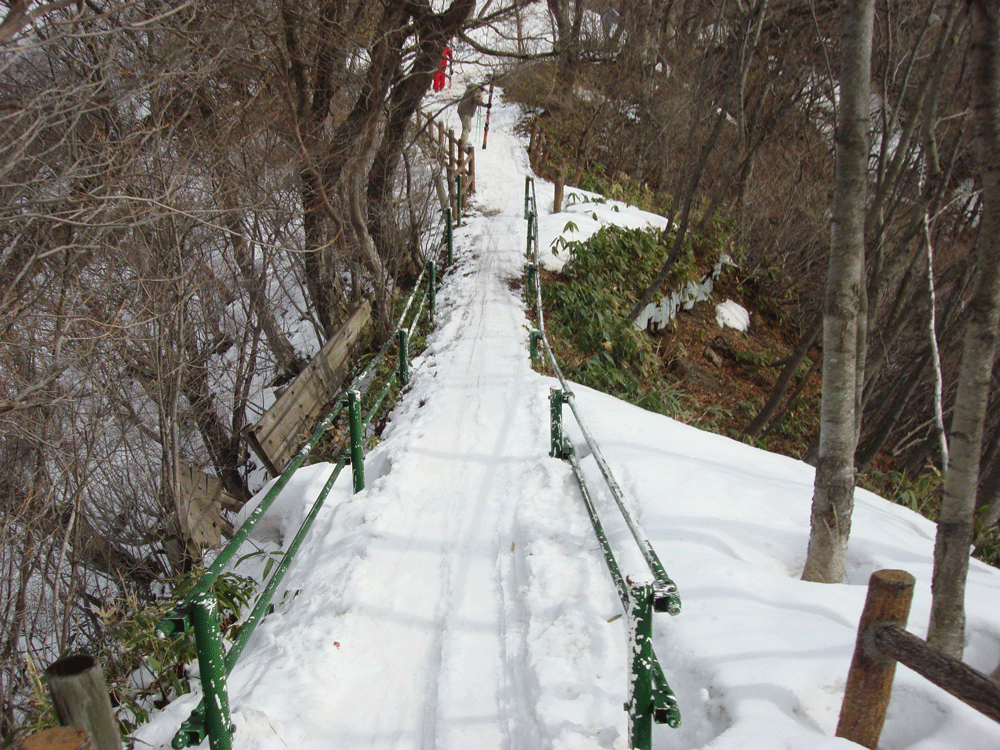 狭く曲がりくねったコースを滑り終えて登山道入り口(スキー場方面から矢沢橋を渡りカーブの辺り)に無事到着しました。ここからですとスキー場まで歩いていくのは大変ですので仲間の団員に車で迎えに来てもらいました。