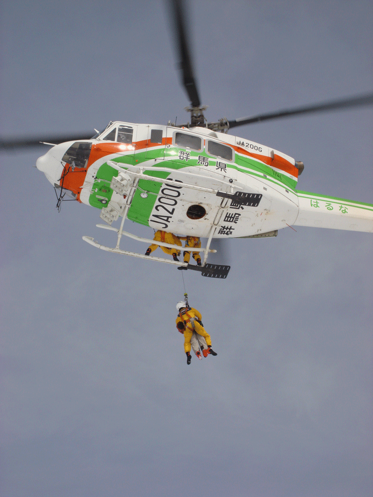 群馬県の防災ヘリコプターの「はるな」まで無事に引き上げられ音楽の森ヘリポートまで搬送されました。