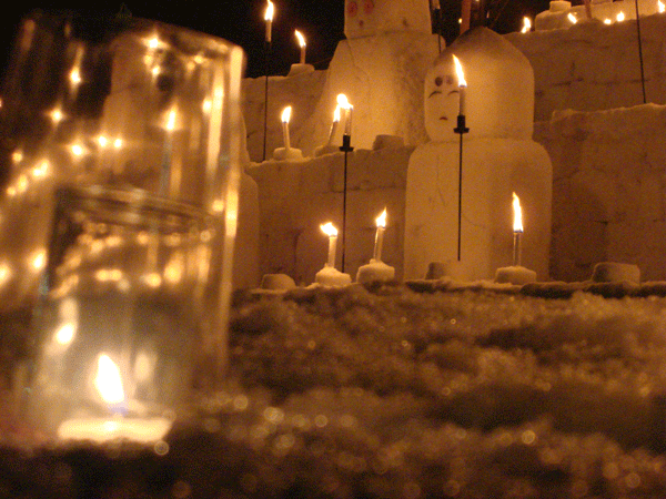 ローソクの入っているガラス容器に「ホヤ」をかぶせています。当日は風が無かったので1つのホヤだけですが風のある時は2つかぶせます。