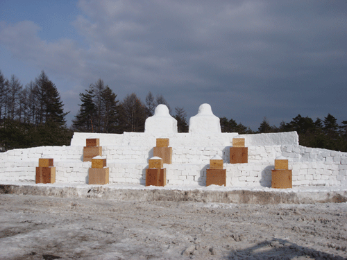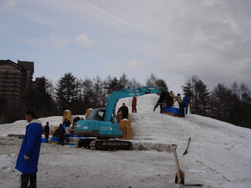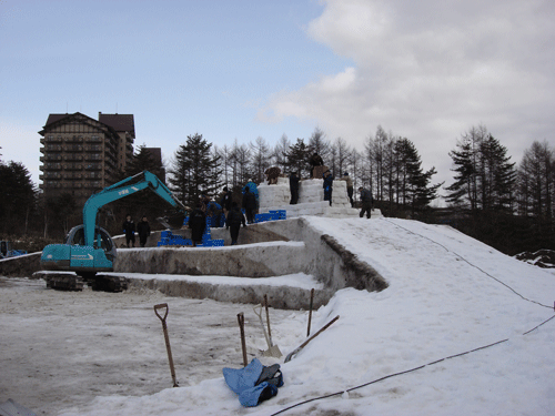 上の画像は予め重機で作った台座です。今年は暖冬で雪が少ない為、昨年より少しちいさくなっています。
