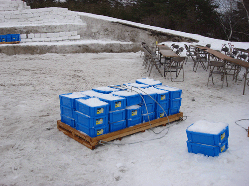 プラスチックのケースに水を含ませた雪を詰めて雪のブロックを作ります。