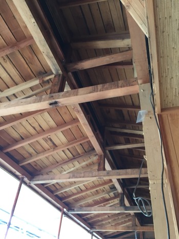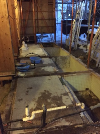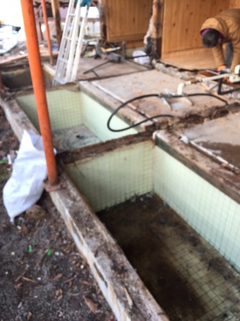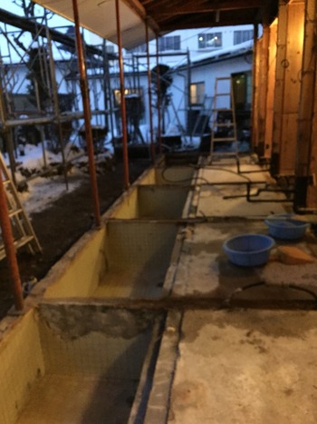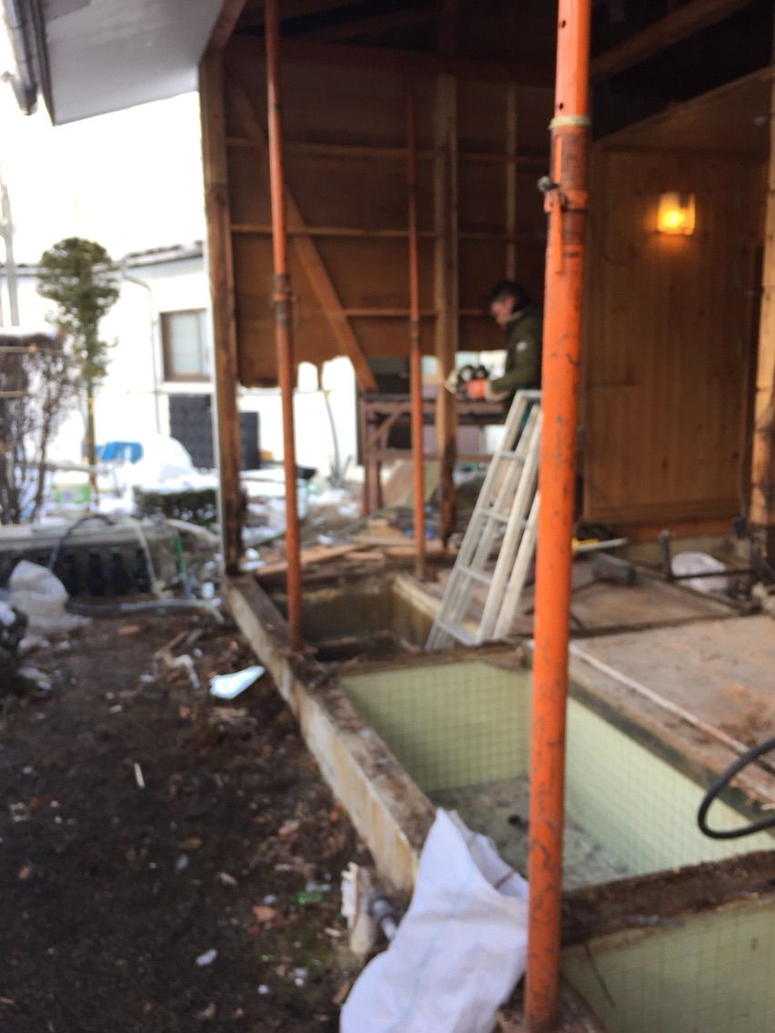 昨日から始まりました貸切風呂の改装工事の2日目です。北風が冷たく雪が舞う寒い中ですが職人さん達のおかげで解体作業もはかどっています。お風呂を仕切る壁も無くなりがらんとしています。廃材の搬出を手伝っていますが柱の根元が腐っていてひどい状態です。この状態では遅かれ早かれ修繕が必要になりましたので良いタイミングでの工事で良かったと思います。