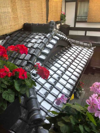 昨夜から雪がちらちらしていましたが朝になったら屋根がうっすらと雪で白くなっていました。