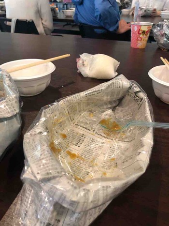 カレーを食べる器は新聞紙とビニール袋で作った物です。