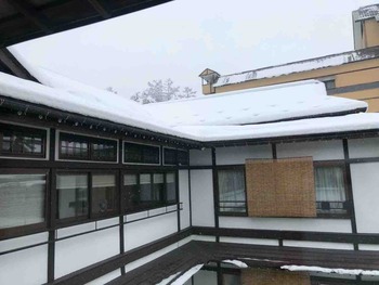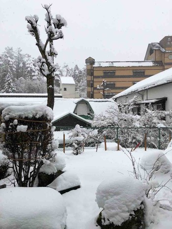 まだ雪は降り続いています 2021 1/24 益成屋ブログ 2021年1月24日 雪はまだ降り止みそうもなく春のようなボタ雪が静かに降り続いています 気温は当館玄関先の気温計で+3℃とそれほどは冷え込んでいないです。 昨日までは大屋根の雪もすっかり溶けて無くなっていましたが、また積もって白くなりました。 白根山方面も雪雲に覆われて見えません。 外の木にボタ雪が積もり白い花が咲いたようです。 貸切風呂のお掃除をした時に見たら、結構積もっていて驚きました。 このまま降り続くと庭園灯が埋もれてしまうくらい積もっていました。 貸切風呂・湯畑源泉関の湯の外の様子です。 貸切風呂・湯畑源泉松の湯の外の様子です。 ボタ雪ですが意外と積もっています。 お車でお越しの際はスタッドレスタイヤの装置やタイヤチェーン等の滑り止めの携行をお願いいたします。ボタ雪で足元も悪いので滑りにくい靴底の履物をおすすめします。 年明けから雪が少なかったので久しぶりに草津の冬らしい雪景色になりました。 益成屋ブログ シェアお願い致します♪ URLをコピーしました! URLをコピーしました! 静かに雪が降り続いています 本日は穏やかな冬場れになりました 関連記事 良いお天気が続いています 2025年12月19日 晴れて良いお天気です 2025年12月18日 雲が広がっています 2025年12月17日 晴れて良いお天気です 2025年12月16日 空が明るくなりました 2025年12月15日 雪が積もりました 2025年12月15日 雨が降ったり止んだりの空模様です 2025年12月14日 晴れて良いお天気になりました 2025年12月13日