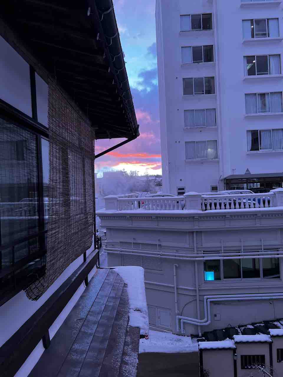 今朝の朝焼けの様子です 2021 12/30 益成屋ブログ 2021年12月30日 朝焼けの綺麗な今朝は雪がちらちら降っています。下の画像3枚は館内から撮った物です。 気温は当館玄関先の気温計で2℃と氷点下ではない暖かい朝になっています。今夜からまた寒気が日本列島を覆う年越し寒波のようですのでつかの間の暖かさです。 益成屋ブログ シェアお願い致します♪ URLをコピーしました! URLをコピーしました! 本日も晴れて良いお天気です 雪がちらちら降っています 関連記事 良いお天気が続いています 2025年12月19日 晴れて良いお天気です 2025年12月18日 雲が広がっています 2025年12月17日 晴れて良いお天気です 2025年12月16日 空が明るくなりました 2025年12月15日 雪が積もりました 2025年12月15日 雨が降ったり止んだりの空模様です 2025年12月14日 晴れて良いお天気になりました 2025年12月13日