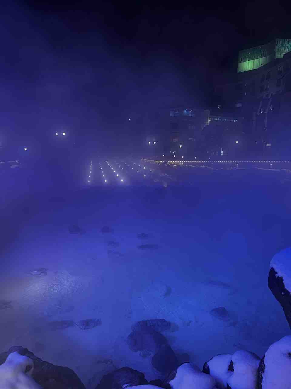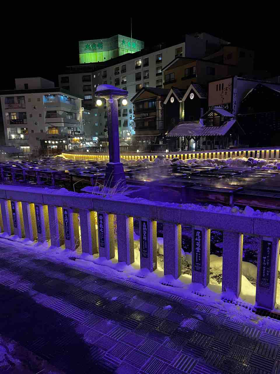 氷点下の寒い夜で湯畑の湯けむりが勢い良く立ち上がっていました。