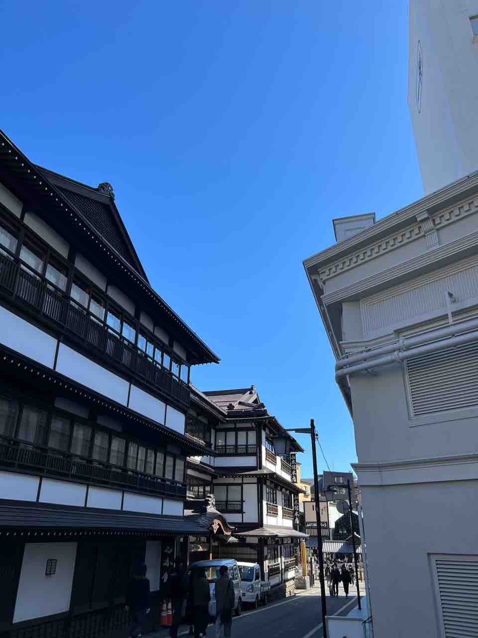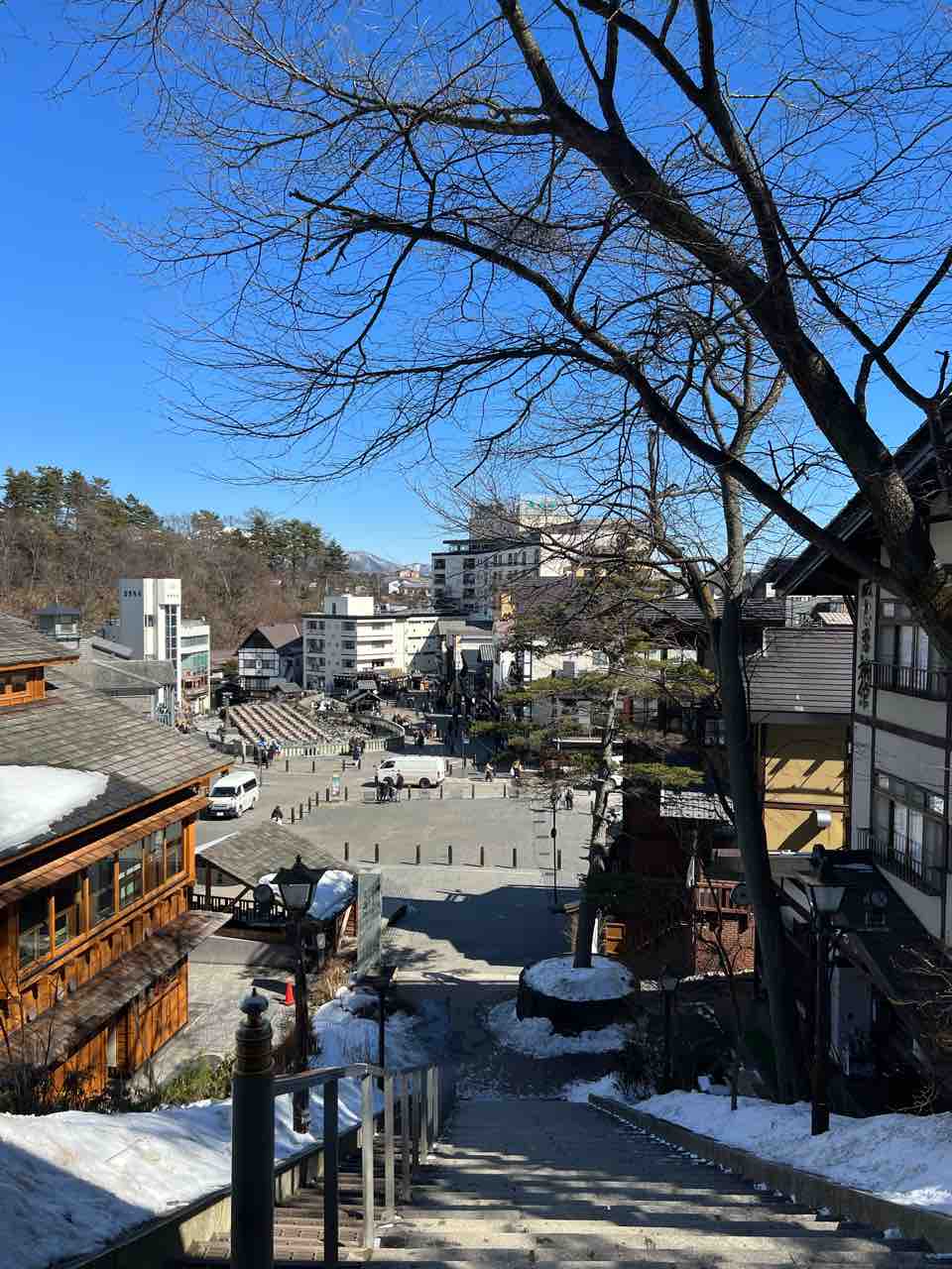 ↓↓↓光泉寺山門からの湯畑です。冬の間に湯畑を彩った湯畑ツリーも先日撤去されました。