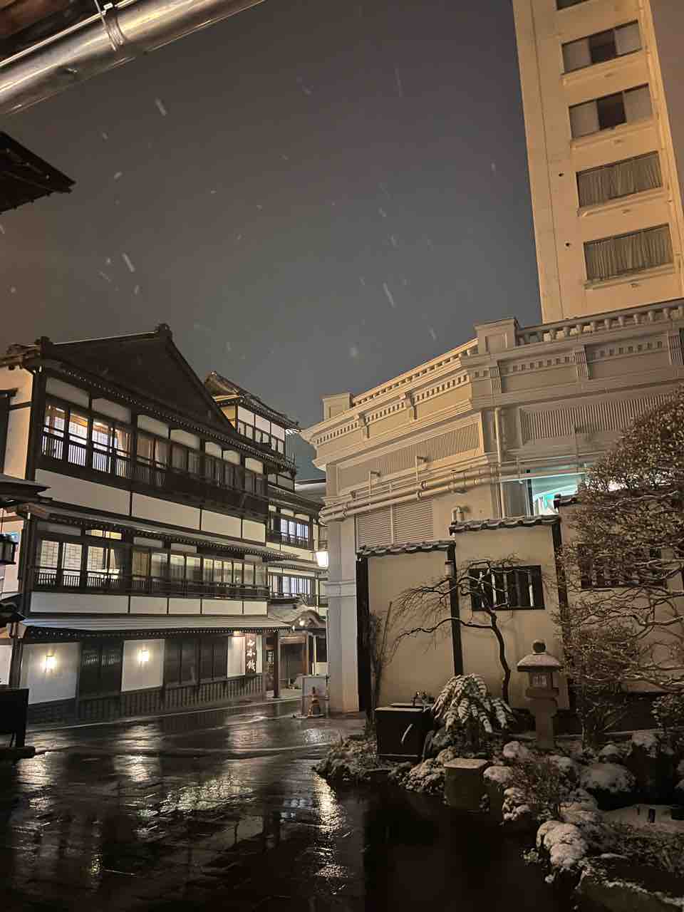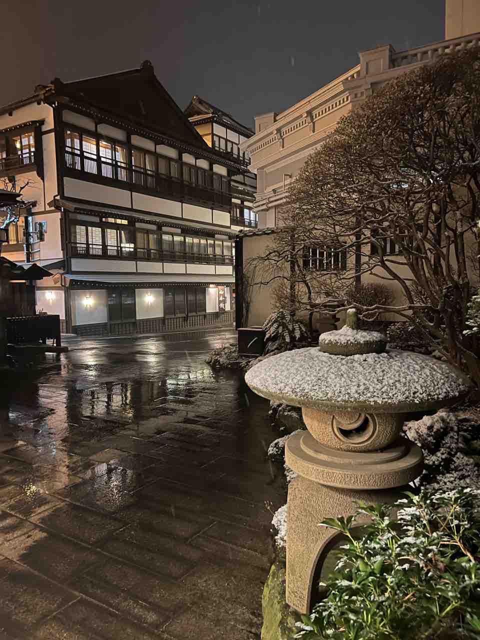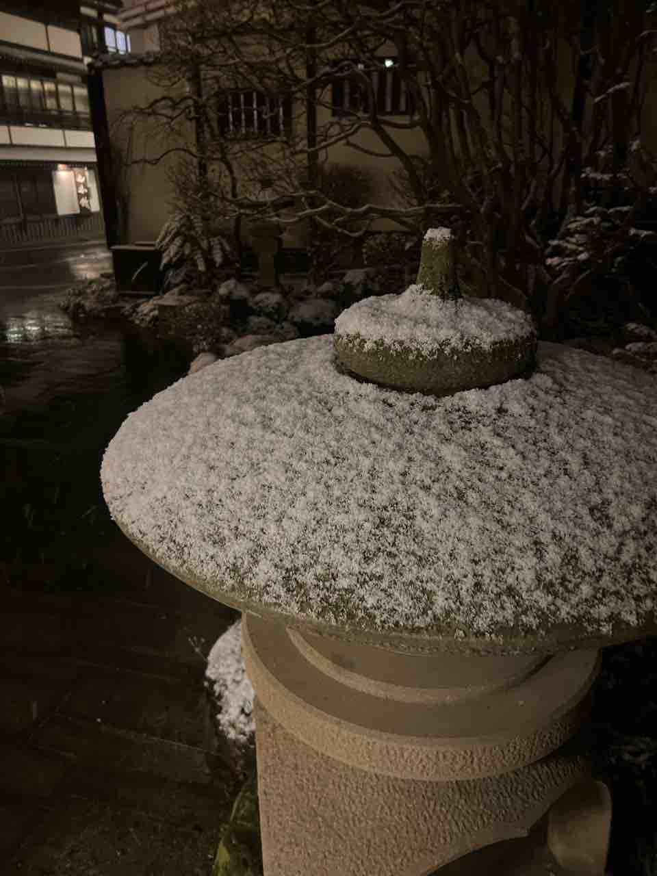 気温は当館玄関先の気温計で0℃まで下がってきました。監視カメラで見る駐車場のお客様の車のフロントガラスが雪で真っ白になっています。