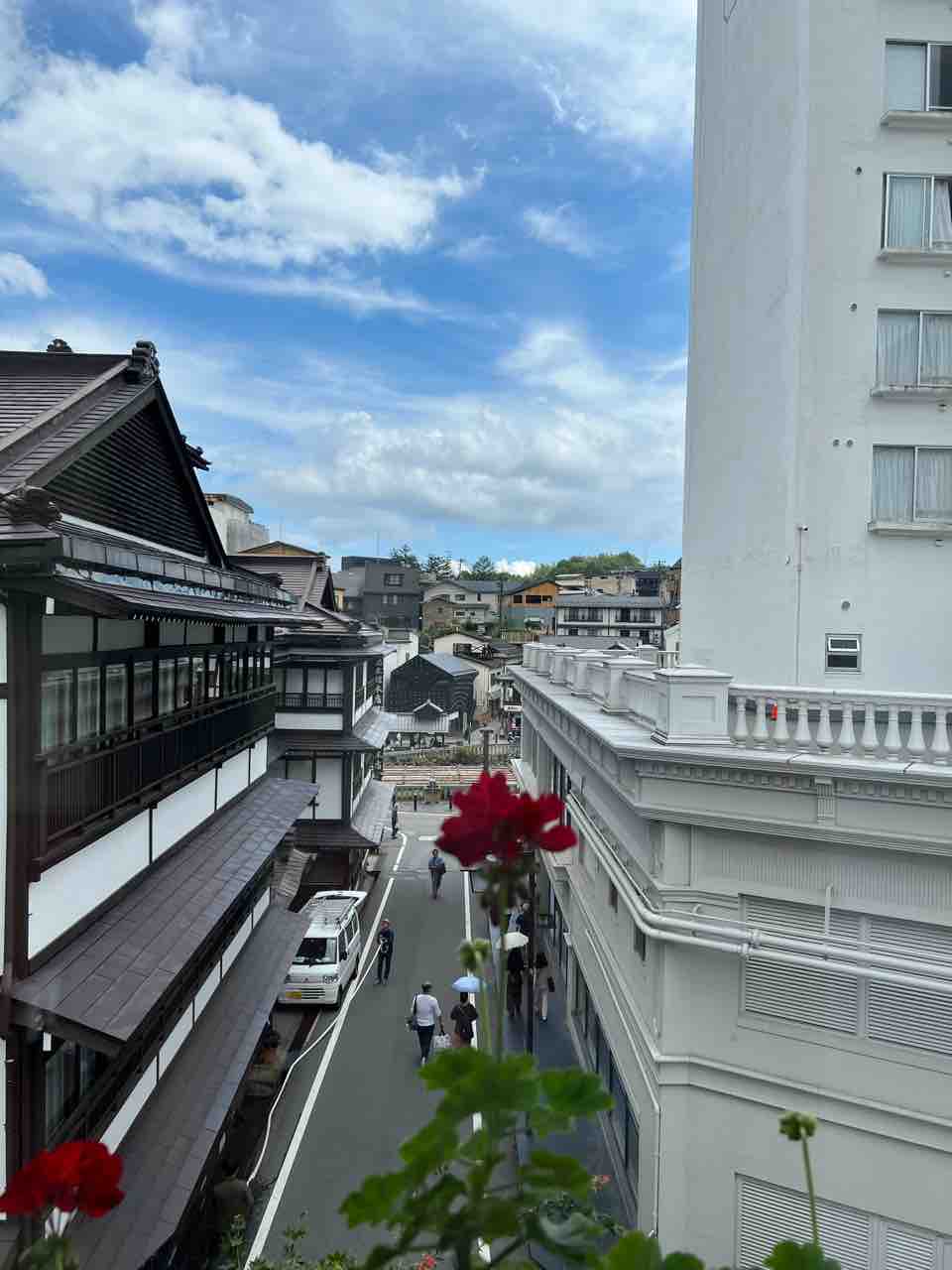 本日も雲が多めの空模様ですがお昼過ぎに湯畑方面を撮ったら青空も広がっていました。