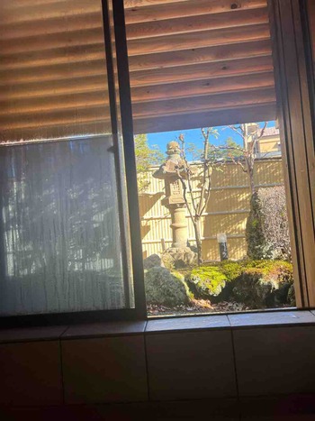 気温は当館玄関先の気温計で12℃まで上がっています。家の中はひんやりとしますが外は暖かいです。